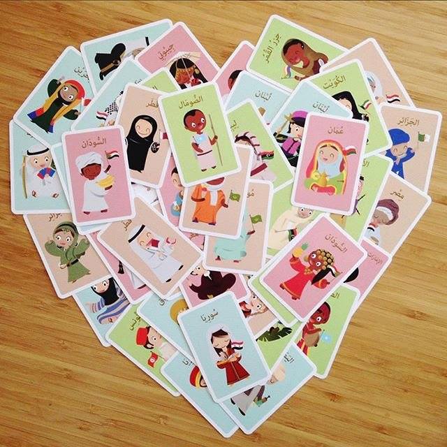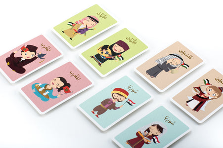 44 بطاقة تمثّل جميع دول الجامعة العربيّة، 3 بطاقات مدرجٌ عليها أعلام البلدان وأسمائها.